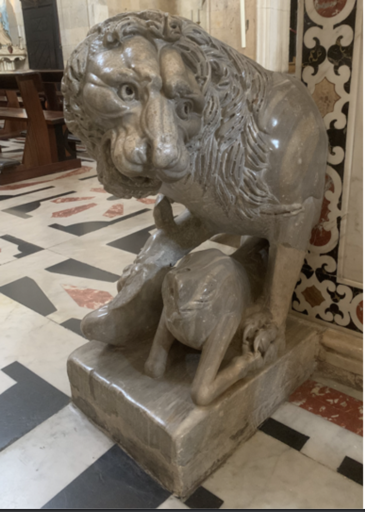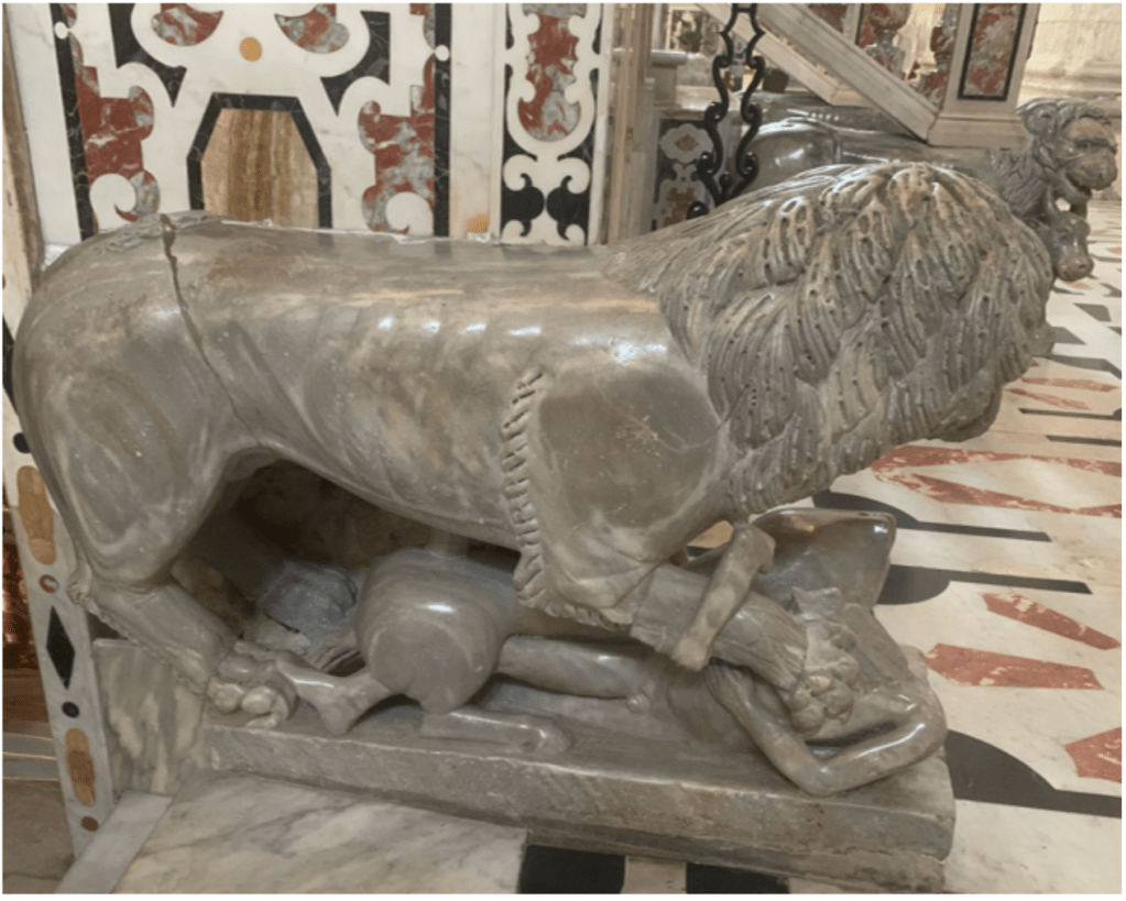 The great Romanesque pulpits of Italy frequently feature lions trampling their prey to support columns and pilasters. The charismatic beasts brought iconographic and historicist references into the complex programs of these ecclesiastic monuments, but the architectonic problems posed by introducing such quadrupeds as structural supports introduced a significant challenge, and called for noteworthy artistic bravura. The series of exceptional pulpits that emerged from the Pisan ambit form the core of the argument, focussing mainly on the pulpit of Guglielmo now in the cathedral of Cagliari, reused within the Baroque chancel screen.