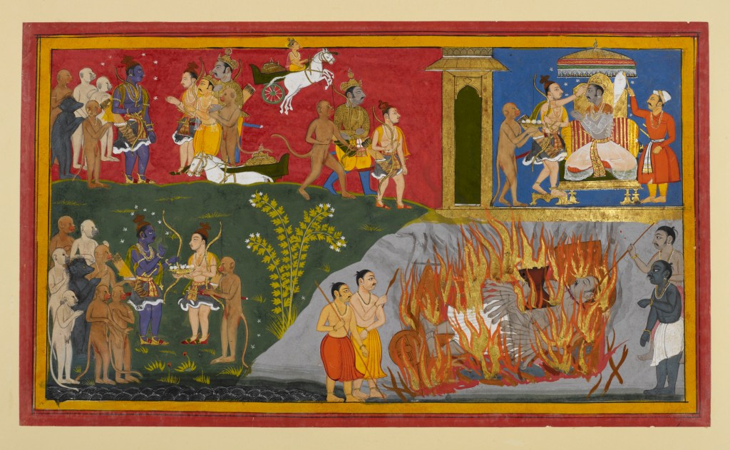 Known for their prodigious taste for food, sex, violence, and human flesh, rakshasas— “demons”—are the epic Ramayana’s anti-heroes. Kumbhakarna is one such—enormous in both appetite and strength. The mid-seventeenth century Mewar Ramayana brings Kumbhakarna to life in pictorial frames barely containing the giant, and his dismemberment and death can be counted among the royal western Indian manuscript’s most dynamic and poignant scenes. Woken from a long sleep so that he could fight the tale’s hero, god-king Rama, Kumbhakarna battles fearlessly to his death in a war that is not his out of loyalty for his brother. Drawing attention to the manuscript’s extravagant use of goldleaf, its swirling repetition of Kumbhakarna’s form, and his gravity-defying limbs, the essay argues that painters lifted Kumbharkana to the realm of the heroic even as Rama severed one limb after another and Kumbharkana crashes to his end.